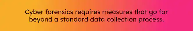 Cyber forensics requires measures that go far beyond a standard data collection process. That’s because required information in a legal setting may not be immediately available. How is it different? Well, it needs recovering and reproduction, authentication and verification, and analysis to connect the available data insights with the appropriate user and their actions.