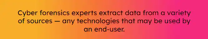 Cyber forensics experts extract data from a variety of sources — any technologies that may be used by an end-user. These include mobile devices, cloud computing services, IT networks, and software applications.