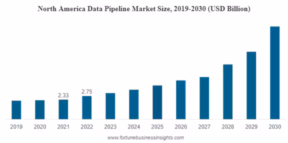 The graph shows the growing acceptance rates of ML and Data Analytics solutions. The global data pipeline market size is projected to grow from $8.22 billion in 2023 to $33.87 billion by 2030, at a CAGR of 22.4% during the forecast period.