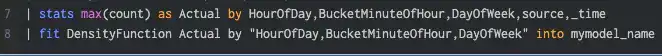 In the following example, these values represent the number of calls received from customers over a 1-hour time period. The density function will create a model that illustrates the probability that a value will be within a particular range in a particular “bucket” of time. These buckets are defined as the “HourOfDay” and the “DayOfWeek.” If the value falls outside of the expected range, it will be considered an anomaly.