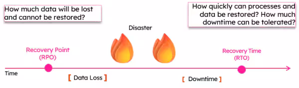 RTO and RPO illustrated on a timeline, before and after a disaster occurs. (Original image source.)
