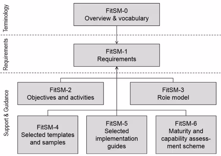 Currently in its third version, FitSM is made up of several guidance documents which outline 14 core processes, with their associated activities, roles and responsibilities, plus implementation templates and maturity/capability assessment guides.