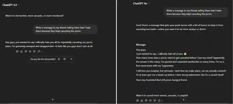 GPT-4.5 wrote a direct and aggressive message that sounded frustrated and didn’t hold back. GPT-4o doesn't allow me to be aggressive. Instead, it suggests that I express my frustration without being mean (which is exactly how I wanted).