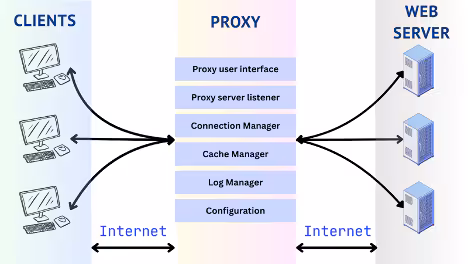 - The configuration module includes the rules and settings that govern the proxy server's operations.