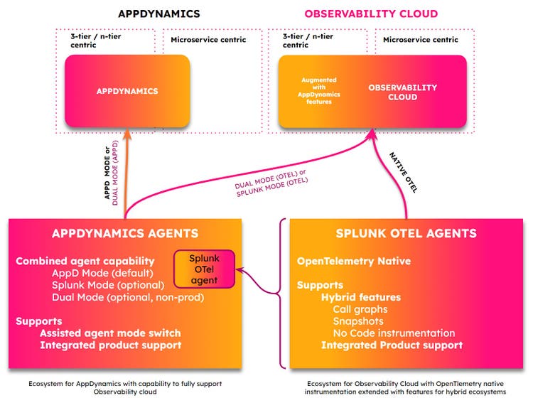 - Splunk Mode, for AppDynamics customers that have truly hybrid applications with transactions that span tiers and microservice and are looking to adopt Observability Cloud. Observability Cloud is being augmented with AppDynamics capabilities to better cover tiered application use cases, which you can read more about below.