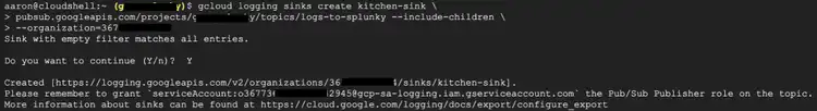 9. Update permission for the service account created in the previous step. You will note the last part of the sink creation command outputted a recommendation to update permissions on the service account created as part of the process. This is required to allow the sink service account to publish messages to the previously created Pub/Sub input topic. To update the permissions, simply copy the entire name and run the following: