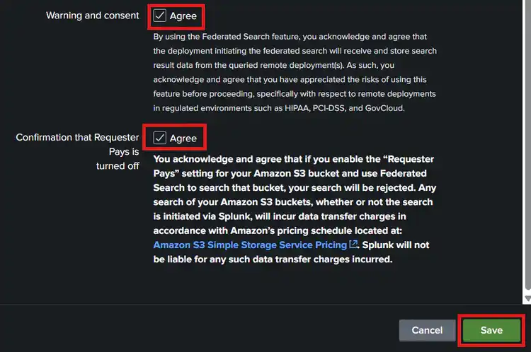 12. Now that we have setup the permissions of Splunk, tick both the agree buttons and Click Save: