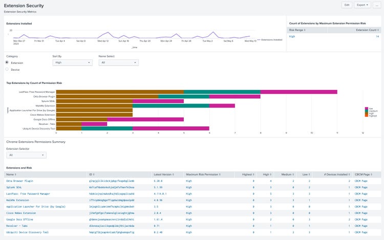 The Google Chrome App and Add-on for Splunk contain prebuilt dashboards and analytics to help investigate the most critical incidents of risky extension installs, malware transfer and unsafe site visits. The solution also includes incident response or automation based detections that make responding to the most important incidents easy by allowing you to automatically: