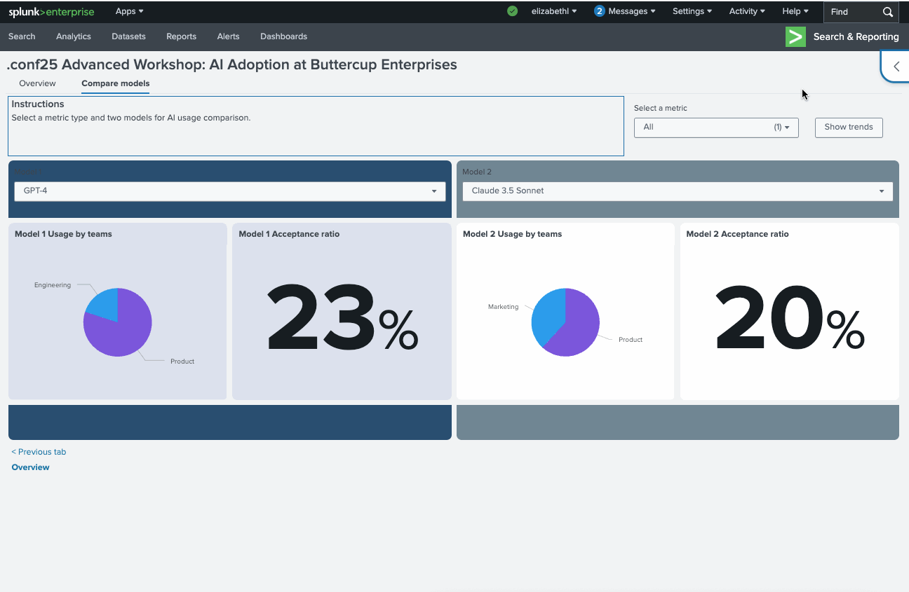 For example, in this dashboard from our .conf25 workshop, Dashboard Studio for Experts and Advanced Users, users can choose what data they want to see and whether they want to view the KPI metric or historical trend.