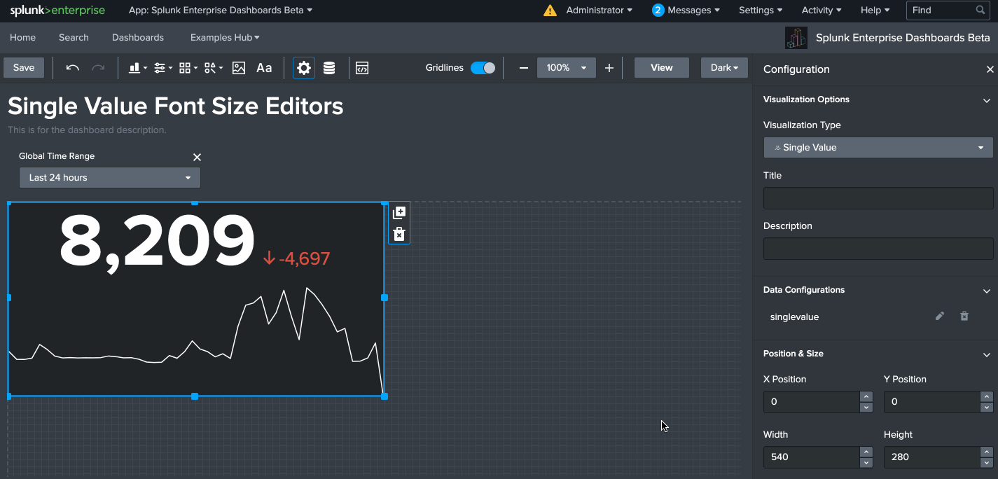 Continuing with the new UI theme, the Splunk Dashboards app (beta) v0.8 also comes with UI editors for single value major and delta font sizes. You can now customize the font sizes and immediately see the visualization update, rather than going back and forth between the UI editor and source code editor.