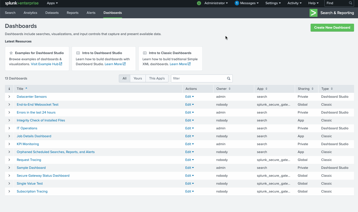 You can access Splunk Dashboard Studio directly within the Search & Reporting app. From the Dashboards listing page, you will see a unified table for dashboards in Classic Dashboards (Simple XML) and Dashboard Studio. You'll also notice some resource cards we've added to the top to provide quick links to the Dashboard Studio Examples Hub, Dashboard Studio documentation, and Classic Dashboards (Simple XML) documentation.