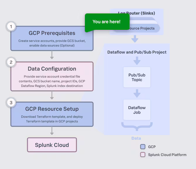 Once all the prerequisites are met, the required GCP resources to support Data Manager should be in place. Now, all that’s required is to provide Data Manager with the relevant resource details. Splunk admins who are not versed in GCP lingo should not worry — the UI provides a brief explanation of each of the resources required, and the flow diagram indicates exactly where you are in the workflow.