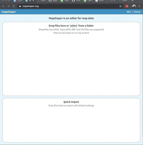 One of my favorite parts of mapshaper, is though you can install their npm package and run commands locally to generate these files, you also can very easily use their web interface. Here is a quick tutorial of how I converted my Connecticut map, followed by some popular switches that I often use for my commands to convert maps (either in the web interface or locally).