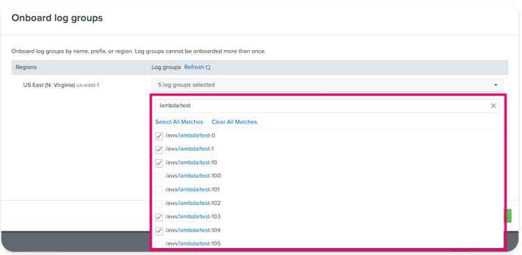 2.6. Log Group Onboarding: If the agent configuration was successful, you should be able to view logs from your EC2. You can filter names you want to onboard, or search through all available log groups.
