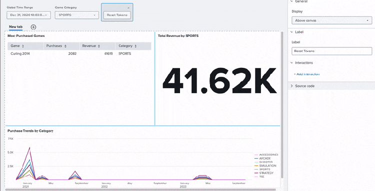 For more interactive dashboards, we've introduced a new button component for end users to interact with. In addition to the existing interaction options, you can also configure your button to reset tokens to default values, effectively resetting the dashboard to its initial state.
