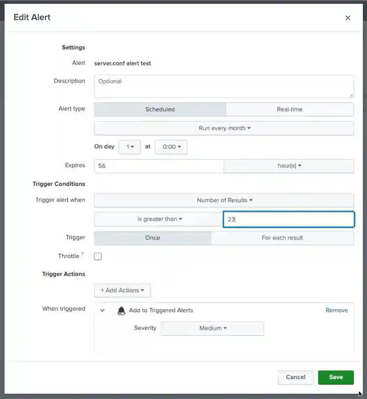 Note: UI changes don’t always map 1-to-1 with .conf file changes. For example a change of certain alert values to 24 hours may show up as null (instead of 24h) in the corresponding .conf file since it is interpreted as a default value in the filesystem. However, the .conf files changes themselves will always show up exactly as they changed in the _configtracker index.