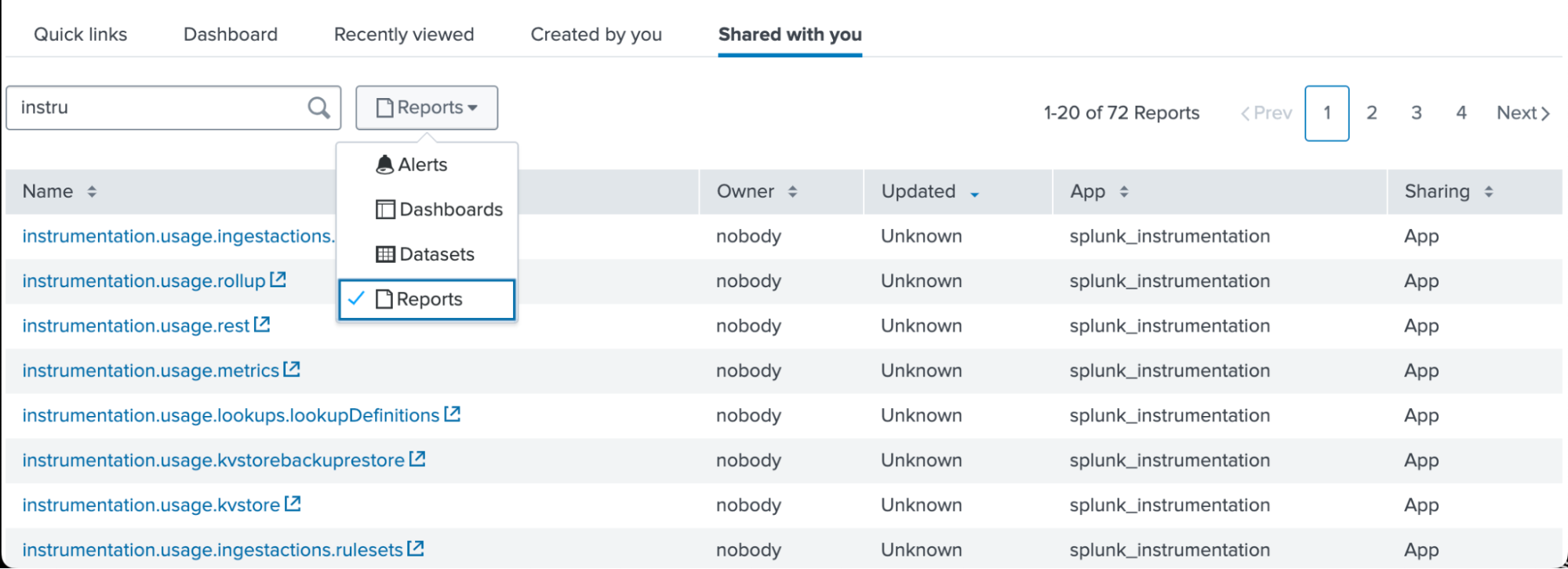 Here, you can find all the knowledge objects (Alerts, Dashboards, Datasets, Reports) you’ve access to i.e., created and updated by you and your colleagues.