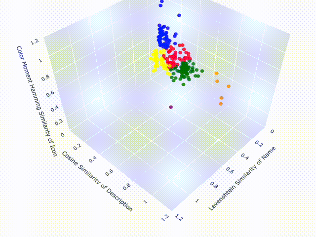 K-means is an unsupervised learning algorithm that partitions a dataset into k distinct, non-overlapping clusters based on the attributes of the data points – in this case, the Levenshtein, Cosine and Color Moment Hamming similarity measures. The algorithm aims to minimize the within-cluster variances and maximize the between-cluster variances, meaning that it seeks to create clusters where members of the same cluster are as similar as possible while also being as different as possible from members of other clusters. By assigning colors to different cluster values, we can visualize our data in a three-dimensional scatter plot, across each of their similarity measures.