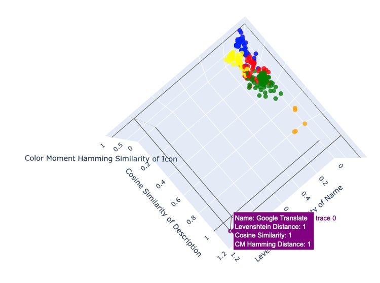 We used the previous three measures to hunt for similarity between names, descriptions and icon appearance individually, but a true masquerading extension could combine more than one of these attributes. To better assess our similar extensions as a whole, we will combine the top results from each category, cluster them with K-means, and then measure the distance from each point to our target vector (Google Translate), using Euclidean distance.