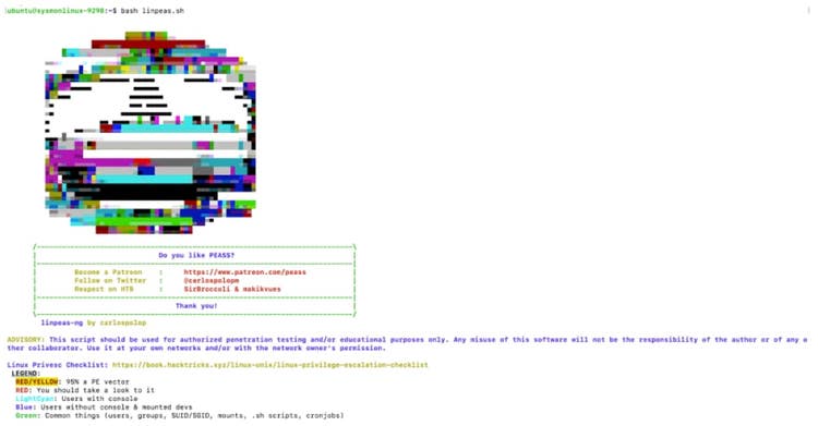 Linpeas is a popular tool used to search for possible paths to escalate privileges on Linux/Unix/MacOS hosts. As seen in the following screenshots, the execution of this tool is self-explanatory as it performs a wide variety of checks.