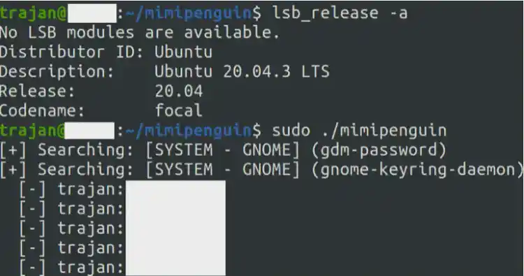 This tool did not work well in the attack range as it requires several libraries not present. Even when the precompiled version malfunctions. However, we can still develop signatures by reading the source code. For example, it greps for specific strings such to detect VSFTPD ( ps -eo pid,user,command | grep vsftpd | grep nobody | awk -F ' ' '{ print $1 }' )or Apache2 configurations ( ps -eo pid,user,command | grep apache2 | grep -v 'grep' | awk -F ' ' '{ print $1 }'. ). Although this tool did not work on the range out of the box, it did work on another lab system, successfully extracting passwords as seen above.