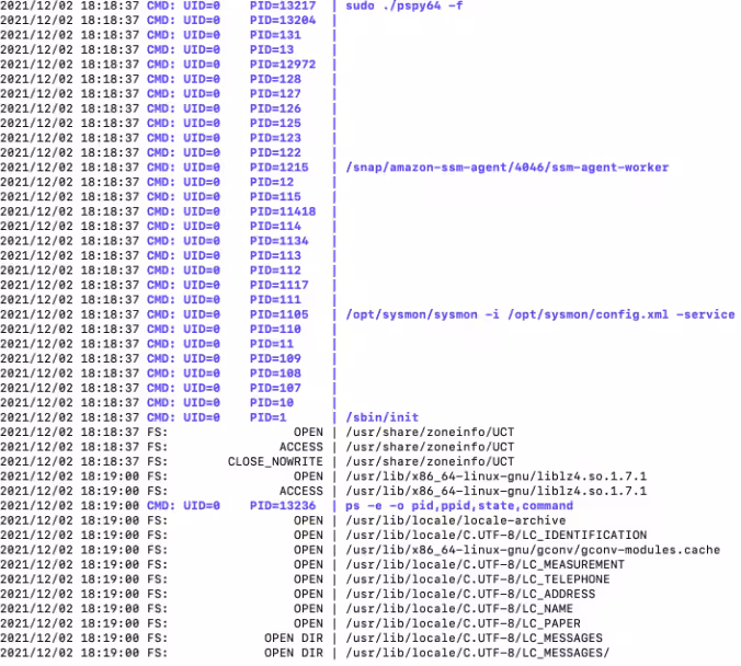 Unfortunately, these syscalls are not currently registered via Sysmon for Linux. However, they can be found using other tools such as sysdig. During this research, we found several monitoring agents which are very noisy, frequently executing commands and making syscalls which can complicate the detection of pspy and lead to false positives. This noise can lead to false positives. However unless there is a resident process expected to execute at the same rate and by the same user, the frequency of execution of this process may indicate post-exploitation activity, we are not just able to measure it yet via Sysmon for Linux.
