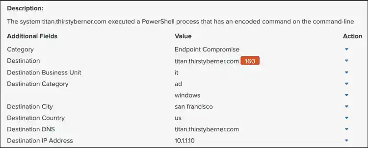 One of the five frameworks that Splunk built into its Enterprise Security (ES) platform is the Asset & Identity framework. Its goal is to contextualize systems and user accounts and associate them with the events that Splunk is collecting and indexing. In the example below, the host titan.thirstyberner.com is located in San Francisco, is categorized as an Active Directory and Windows system, it part of the IT business unit and has an IP address of 10.1.1.10. The framework is pulling these supporting pieces of information for every system (asset) and user account (identity) that have information for when an analyst reviews events.