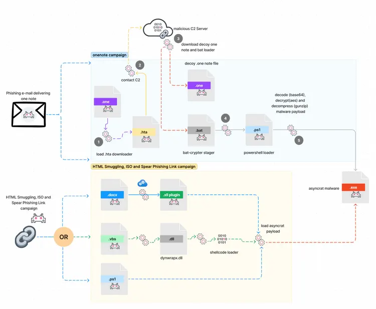 Figure 1 shows a short summary infection chain of OneNote campaigns that are discussed further in this article, including other interesting phishing campaigns that load different scripts to execute AsyncRAT.