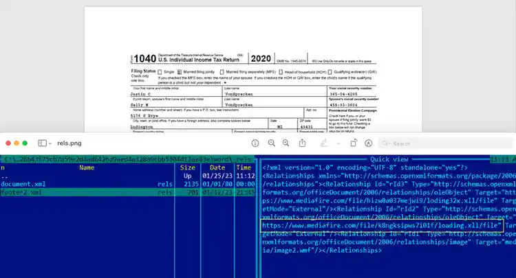 In February 2022, Microsoft pushed an update to disable macros by default in Office products. Because of this, many threat actors and adversaries worked to find another way to weaponize Microsoft Office documents. One of those techniques is abusing .rels file containing properties that define how the document is constructed. These properties can be used to reference remote resources via URLs. Figure 12.1 shows a screenshot of what this document looks like and how it abuses the footer2.xml rels properties of this Office document to connect to a malicious link to download another .xll, which then downloads AsyncRAT.