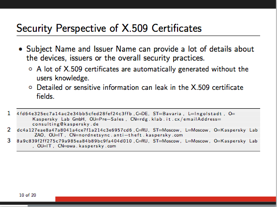 Security analysts across the world are nowadays familiar with the Passive DNS technique that allows DNS information to be collected passively, just by listening to DNS requests in and out of a network. The idea Alexandre and Eireann came up with was to apply similar techniques to SSL/TLS certificates so they can keep track of certificates and their association over time.