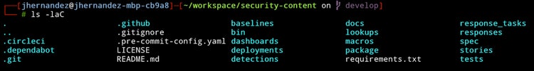 Starting from the left the folder: .circleci contains the CI configuration files. We will come back to this later in the Testing portion of the guide. Followed by .dependabot This contains the configuration for dependabot, a tool that keeps dependencies up-to-date for open source projects. The folder .git and .github, and .gitignore are various files used by Github to track changes locally, the configuration of the project and other things. ⚠️ I do not recommend you change these. The security-content uses pre-commit hooks which are configured by the .pre-commit-config.yaml to implement checks for common mistakes like correct YAML, JSON, and requirements.txt typos among other things during commits. The most important parts 🧩 of security-content are: