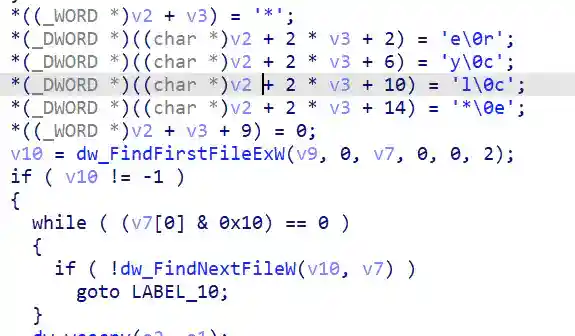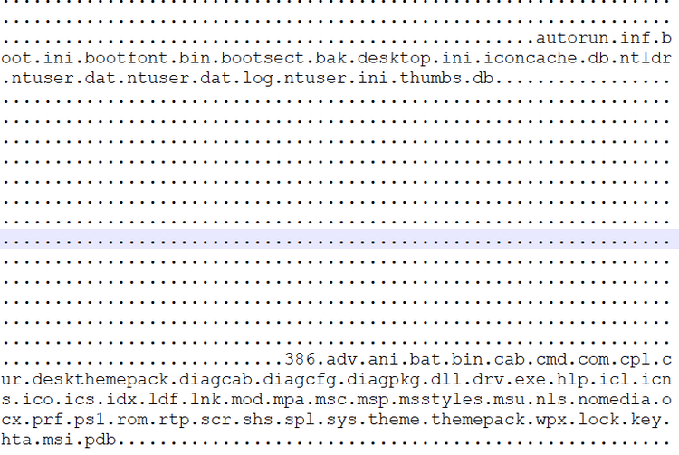 This ransomware payload has a configuration feature consisting of a list of folder names, files, and file extensions it skips during encryption.