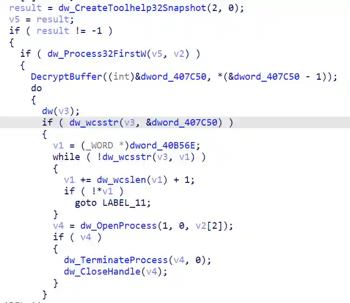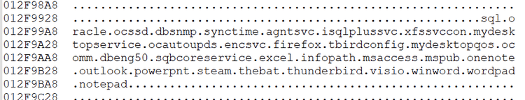 Similar to other ransomware payloads it also tries to kill processes or services that may cause access failure to the files targeted for encryption. Below is the decrypted list of strings related to the process name and service name targeted for termination.