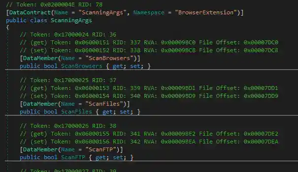 After establishing a connection to its C2, it will fetch another configuration setting data from its C2 server that will fill the ScanningArg() class, which is a data structure of boolean variables that will serve as a switch to RedLine functionality.