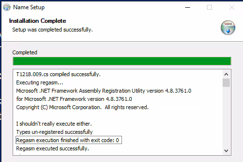 nsExec::ExecToLog 'C:\Windows\Microsoft.NET\Framework\v4.0.30319\regasm.exe /U "$INSTDIR\T1218.009.dll"'