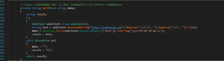 We also discovered an interesting public IP check web service used to retrieve the public IP address of the compromised host. Figure 13 shows a screenshot demonstrating how http[:]//icanhazip[.]com is used to obtain the IP address.