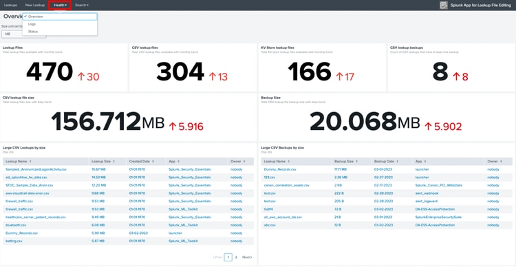 To free up disk space, users might want to see which lookup files and their respective backups take up the most space. The 4.0.1 release of the Splunk App for Lookup File Editing includes an overview dashboard with metrics and visualizations that can help users identify troublesome lookups such as ones that get filled faster, ones with multiple backups, and ones that need to be cleaned up. This dashboard view also shows trends that users can track on a monthly basis.