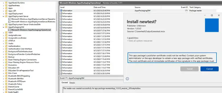 For the installation of our test MSIX instance, when the certificate is not installed, an event is generated in \Microsoft-Windows-AppxPackaging/Operational.evtx with EventCode 171. The MSIX did not install, but was just double clicked.