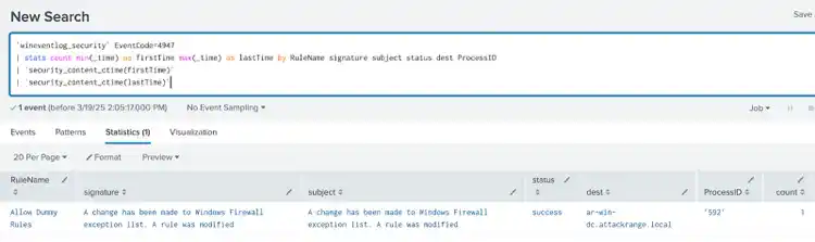 | stats count min(_time) as firstTime max(_time) as lastTime by RuleName signature subject status dest ProcessID