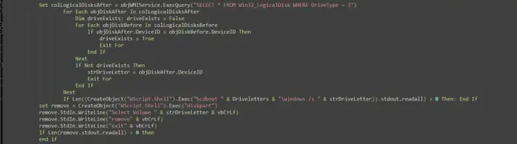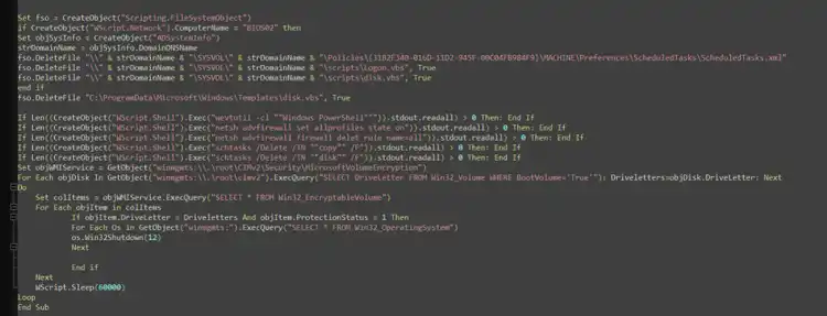 The code block below illustrates the script code of the ShrinkLocker malware. In addition to modifying the registry entries listed above, it also attempts to install BitLocker using either the ServerManagerCmd command or PowerShell.