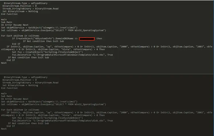 If the operating system is one of the above, the malware proceeds to delete a specific script file located at C:\Programdata\Microsoft\Windows\Templates\disk.vbs.