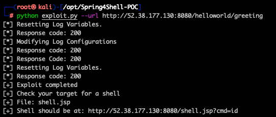 Exploit The following sample was used to validate the vulnerability https://github.com/reznok/Spring4Shell-POC . Each attempt worked and a shell.jsp was written to disk and by visiting the site a response would be provided.