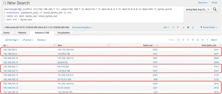 sourcetype=fgt_traffic src=192.168.225.* NOT (dest=192.168.* OR dest=10.* OR dest=8.8.4.4 OR dest=8.8.8.8 OR dest=224.*) bytes_out>0