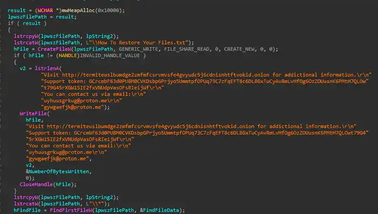 Termite Ransomware employs a strategy to maximize its encryption impact by targeting all possible root drives on the compromised system. In cases where it encounters a drive that might be protected or difficult to access, Termite uses the SetVolumeMountPoint() API. This API allows the ransomware to create mount points for specific volumes, essentially mounting them as accessible drives. By doing this, the ransomware can bypass some access restrictions and ensure it can fully encrypt data on those drives, even if they were initially harder to target.