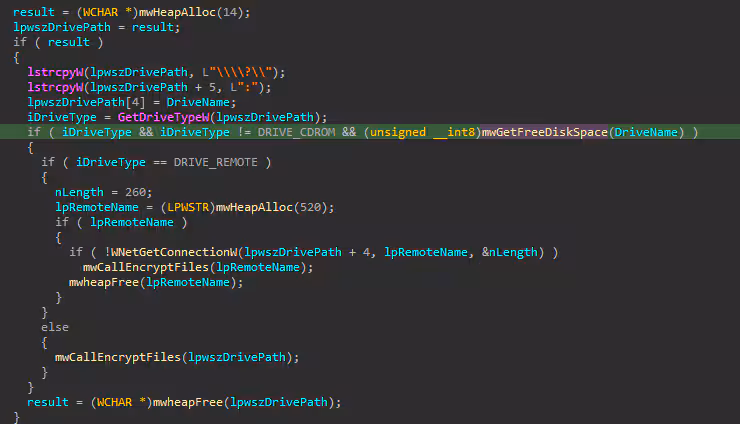 Figure 06 shows a screenshot of the Termite Ransomware code that enumerates drives and checks whether the drive type of each path is a remote drive. If the drive is identified as remote, the ransomware proceeds to enumerate all the files and data on the drive, marking them for encryption.