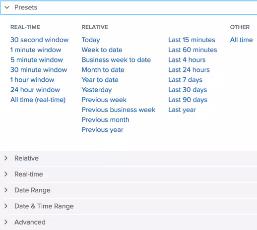 On the right side of my Splunk search bar, a drop-down known as the Time Picker allows me to set the time range that the search will run within. Clicking on the drop-down returns a number of time presets, as well as the ability to search specific data and time ranges. The use of Time Picker in searches is incredibly important during any hunt.