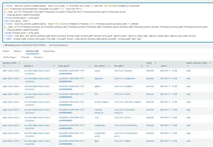 This analytic looks for a deletion of init daemon script in a linux machine.daemon script that is placed in /etc/init.d/ is a directory that can start and stop some daemon services in linux machines.This TTP can be also a good indicator of a malware trying to wipe or delete several files like AcidRain malware.